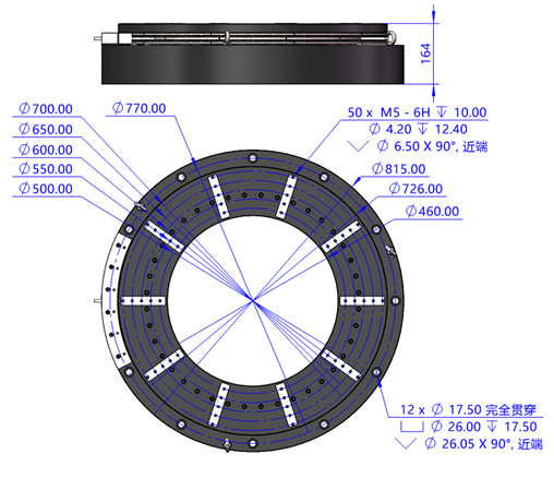 大中空尺寸460mm 大型中空转台采用力矩电机+旋转光栅+机械轴承,实现大中空460mm孔径。专用光学检测领域。