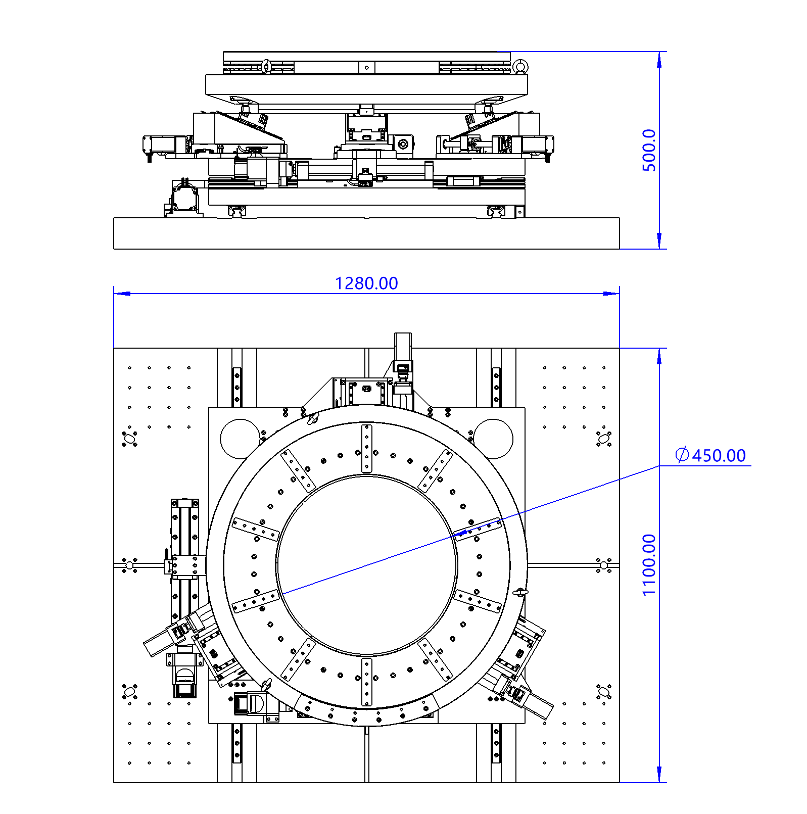 串并联混合的TRIPOD结构,直线步进电机+丝杠+光栅反馈,可实现三个直线和三个旋转方向的六轴位移运动,带动光学负载实现六轴方向上的高精度的位移调节,本设计为大型中空光学检测使用
