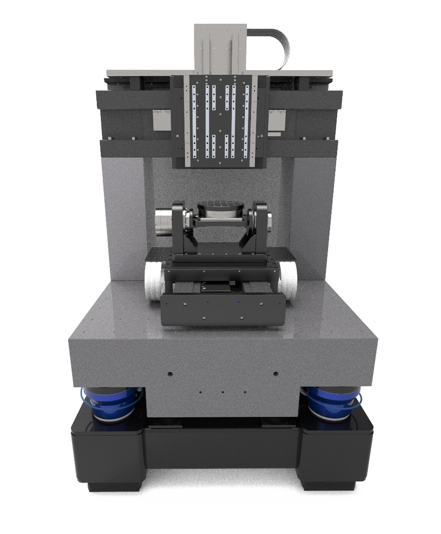该系统采用了天然花岗岩作为床身,焊接式一体机架以及气浮式的精密隔振器,可以很好的隔离设备在使用过程中受到的各种振动。同时各个直线轴采用了气浮导轨直线电机的运动机构,配合高精度直驱电机带动的AC轴,可以获得非常高的空间定位精度。